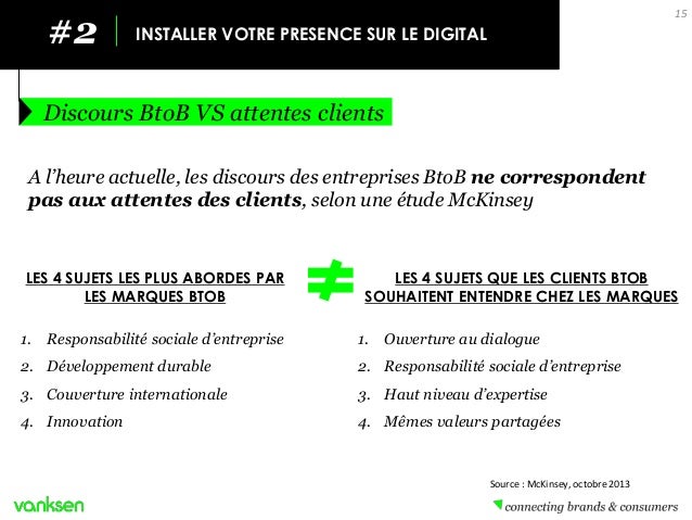 - 15. Discours BtoB VS attentes clients LES 4 SUJETS LES PLUS ABORDES PAR LES MARQUES BTOB LES 4 SUJETS QUE LES CLIENTS BTOB SOUHAITENT ENTENDRE CHEZ LES MARQUES 1.Responsabilité sociale d’entreprise 2.Développement durable 3.Couverture internationale 4.Innovation 1.Ouverture au dialogue 2.Responsabilité sociale d’entreprise 3.Haut niveau d’expertise 4.Mêmes valeurs partagées A l’heure actuelle, les discours des entreprises BtoB ne correspondent pas aux attentes des clients, selon une étude McKinsey Source : McKinsey, octobre 2013 15