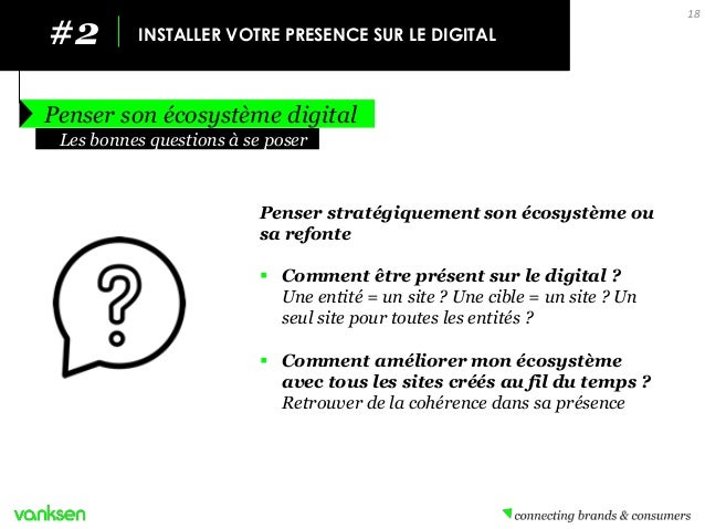 - 18. Penser stratégiquement son écosystème ou sa refonte Comment être présent sur le digital ? Une entité = un site ? Une cible = un site ? Un seul site pour toutes les entités ? Comment améliorer mon écosystème avec tous les sites créés au fil du temps ? Retrouver de la cohérence dans sa présence Penser son écosystème digital #2 Les bonnes questions à se poser 18