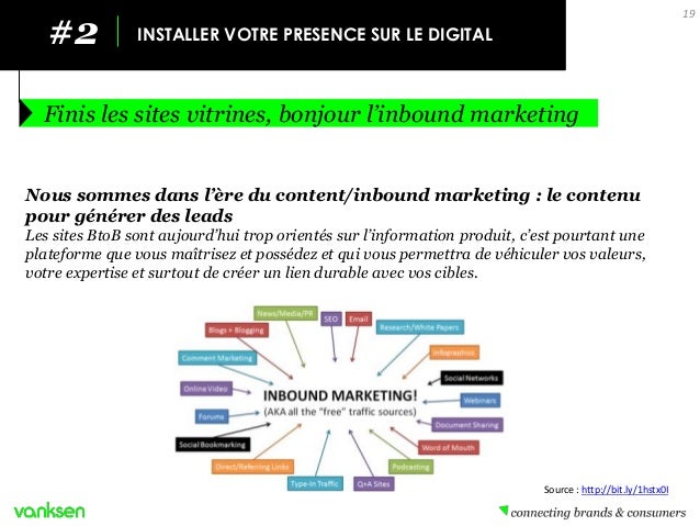 - 19. Finis les sites vitrines, bonjour l’inbound marketing Nous sommes dans l’ère du content/inbound marketing : le contenu pour générer des leads Les sites BtoB sont aujourd’hui trop orientés sur l’information produit, c’est pourtant une plateforme que vous maîtrisez et possédez et qui vous permettra de véhiculer vos valeurs, votre expertise et surtout de créer un lien durable avec vos cibles. #2 Source : http://bit.ly/1hstx0I 19