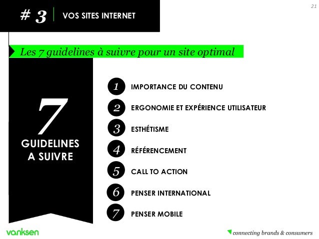 - 21. 7 GUIDELINES A SUIVRE IMPORTANCE DU CONTENU ERGONOMIE ET EXPÉRIENCE UTILISATEUR ESTHÉTISME RÉFÉRENCEMENT CALL TO ACTION PENSER INTERNATIONAL PENSER MOBILE 1 2 3 4 5 6 7 # 3 VOS SITES INTERNET Les 7 guidelines à suivre pour un site optimal 21