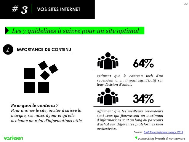 - 22. IMPORTANCE DU CONTENU 1 Les 7 guidelines à suivre pour un site optimal Pourquoi le contenu ? Pour animer le site, inciter à suivre la marque, ses mises à jour et qu’elle devienne un relai d’informations utile. # 3 VOS SITES INTERNET 64% estiment que le contenu web d’un revendeur a un impact significatif sur leur décision d’achat. affirment que les meilleurs revendeurs sont ceux qui fournissent un maximum d’informations tout au long du parcours d’achat sur différentes plateformes bien orchestrées. Source : BtoB Byuer behavior survey, 2013 34% 22