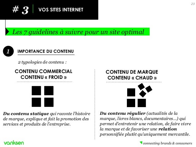 - 23. # 3 1 Du contenu statique qui raconte l’histoire de marque, explique et fait la promotion des services et produits de l’entreprise. Du contenu régulier (actualités de la marque, livres blancs, documentaires…) qui permet d’entretenir une relation, de faire vivre la marque et de favoriser une relation personnifiée plutôt qu’uniquement mercantile. 2 typologies de contenu : Les 7 guidelines à suivre pour un site optimal VOS SITES INTERNET 23 CONTENU COMMERCIAL CONTENU « FROID » CONTENU DE MARQUE CONTENU « CHAUD » IMPORTANCE DU CONTENU