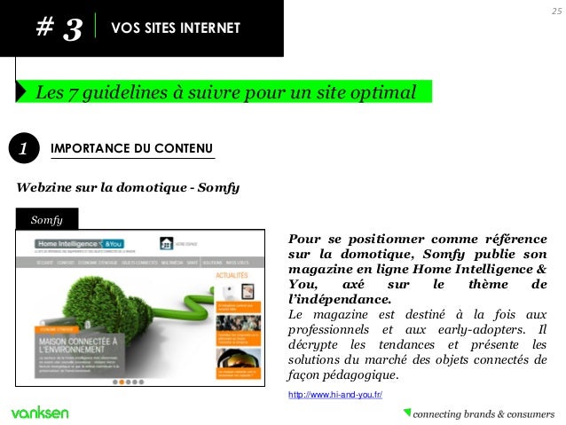 - 25. # 3 1 Webzine sur la domotique – Somfy Les 7 guidelines à suivre pour un site optimal VOS SITES INTERNET Pour se positionner comme référence sur la domotique, Somfy publie son magazine en ligne Home Intelligence & You, axé sur le thème de l’indépendance. Le magazine est destiné à la fois aux professionnels et aux early-adopters. Il décrypte les tendances et présente les solutions du marché des objets connectés de façon pédagogique. Somfy 25 http://www.hi-and-you.fr/ IMPORTANCE DU CONTENU