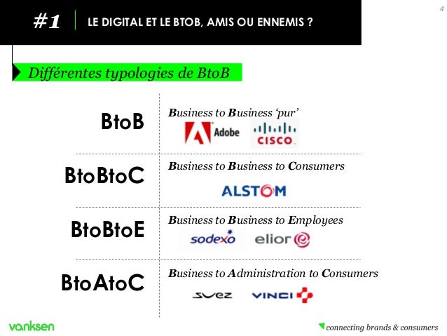 - 4. Différentes typologies de BtoB : Business to Business ‘pur’ (BtoB), Business to Business to Consumers (BtoBtoC), Business to Business to Employees (BtoBtoE), Business to Administration to Consumers (BtoAtoC).